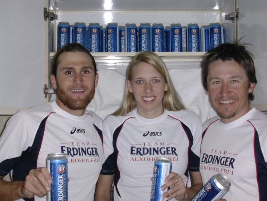 Kapitän Oli Glaser ist der unstylischste Triathlet, mal abgesehen vom legendären Josef Jeschke, mit dem ich je trainiert habe. Statt eines Karbonvollbluts und den neusten Gimmicks der Triwelt erblickten wir sein ebay-ersteigertes Triathlonvollaustattungspaket: Vom zu kleinen Helm über eine schreckliche Sonnenbrille, bis zu den Staubkäppchen auf allerdings immer noch brauchbaren Shamal-Laufrädern und gab Anlass zu verstärktem Kopfschütteln. Darüberhinaus ließ mich sein Beinpelz erschaudern. Aber der Kampfgeist und der Enthusiasmus, sowie seine Müdigkeitsresistenz nötigten uns Profis Bewunderung ab. Im Flugzeug hat er hoffentlich lange Hosen an, denn trotz heftiger Bemühungen lies sich Oli nicht zur Beinrasur bewegen.